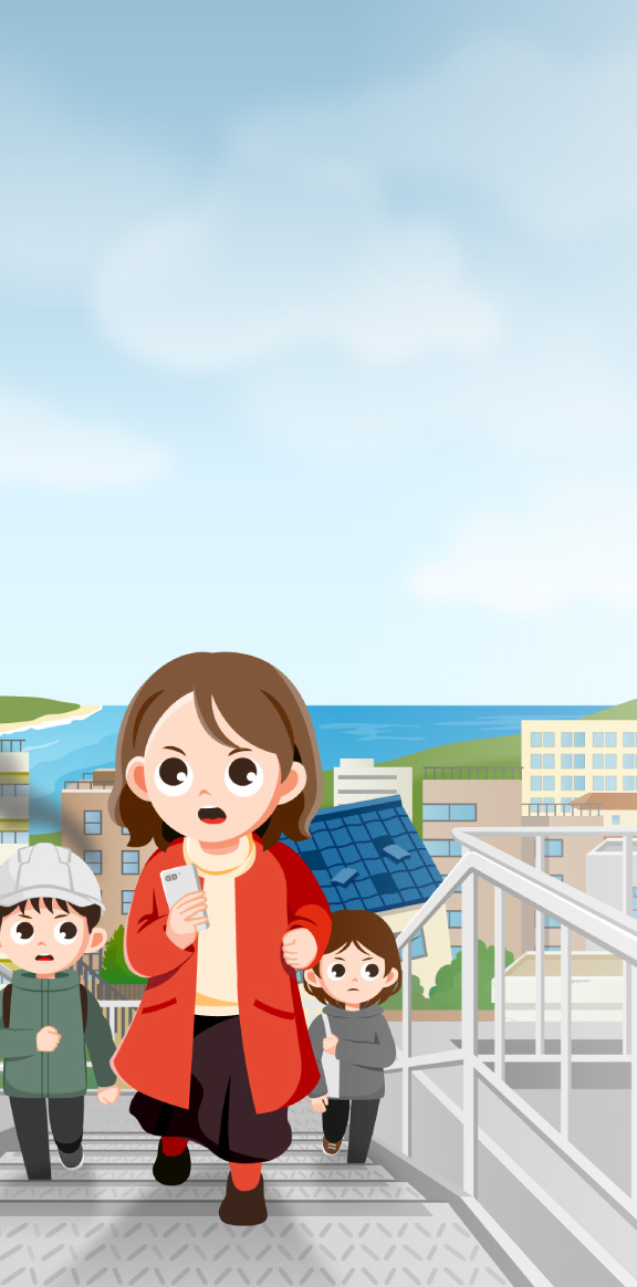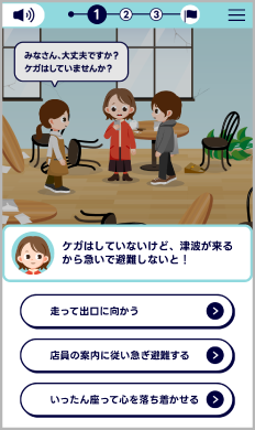 主人公の置かれた状況を考えながら最適な選択肢をタップして、地震発生時の行動をシミュレーションしよう。