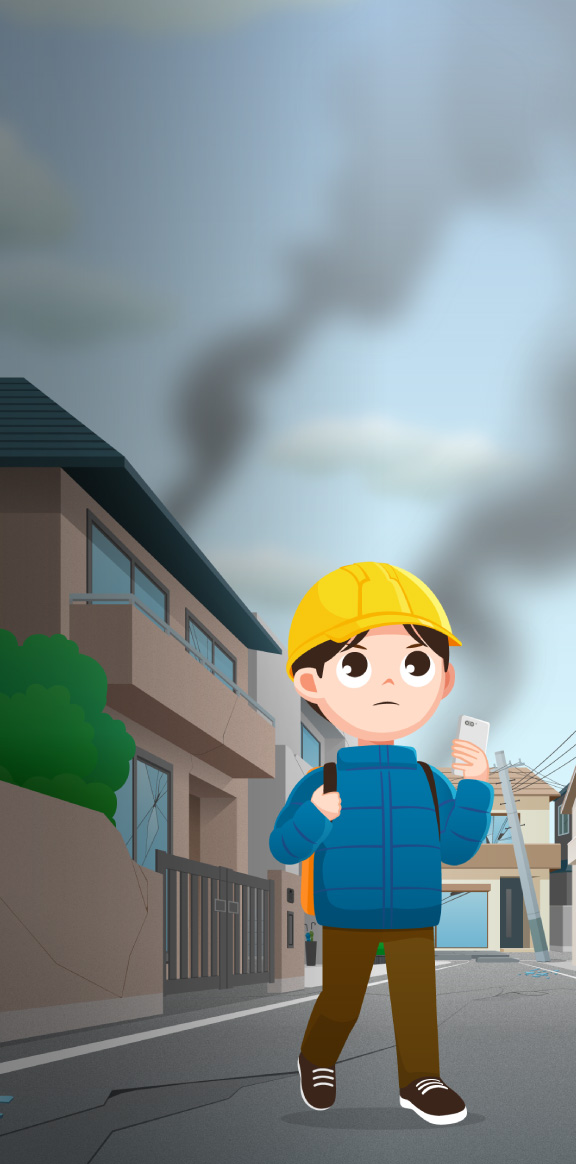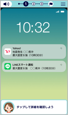 主人公のスマホ画面を一緒に見ながら、地震が起きたとき役立つ機能を学ぼう。