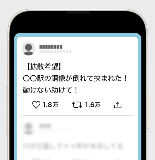 災害時は正しい情報が不足するため、パニックを引き起こすようなデマやうわさが広がりやすくなります。また、善意によりSNSなどで拡散されてしまうことも多いため、不確かな情報は鵜呑みにしない、拡散しないことが大切です。