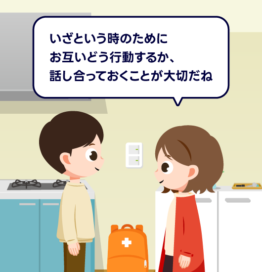 災害の備えとして事前に家族で決めておきたいことは、別々の場所で被災した場合の安否確認の手段です。また、連絡がとれない場合も想定し、避難場所とそこまでの経路、そして集合場所も具体的に決めておきましょう。